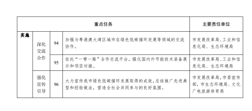 (二十八)深化交流合作。抓住“双核驱动、双区联动”的重大机遇,加强与粤港澳大湾区城市在绿色低碳循环发展等领域的交流协作。依托“一带一路”合作交流平台,强化国内外节能技术装备展示和项目对接,积极引入环境治理先进技术,加快推动产业提升与环境治理深度融合,促进产业连片集聚区绿色升级,加强开放型环保交流合作。