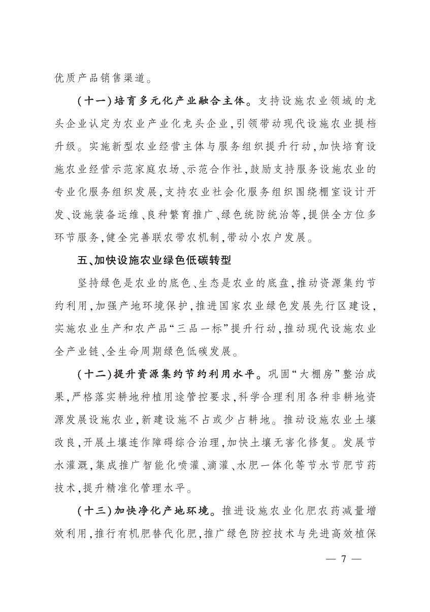 习近平总书记指出,“要树立大食物观,发展设施农业,构建多元化食物供给体系”,“设施农业大有可为,要发展日光温室、植物工厂和集约化畜禽养殖,推进陆基和深远海养殖渔场建设,拓宽农业生产空间领域”。大力发展现代设施农业,加快用现代技术与先进设施装备武装农业,既可保障农产品稳定安全供给,也可弥补水土资源短缺、减少耕地占用;既可促进农业转型升级和增加农民收入,也可带动关联产业发展,畅通城乡经济循环,是建设农业强国的重要任务,是推进农业农村现代化的重要举措。经过多年建设,我国设施农业发展取得长足进步,为保障粮食和重要农产品稳定安全供给发挥了重要作用,但还存在总量不足、质量不高等问题,不能适应建设农业强国的需要。为贯彻落实党的二十大精神,按照中央有关决策部署,推动《全国现代设施农业建设规划(2023—2030年)》落实,加快现代设施农业高质量发展,制定本指导意见。